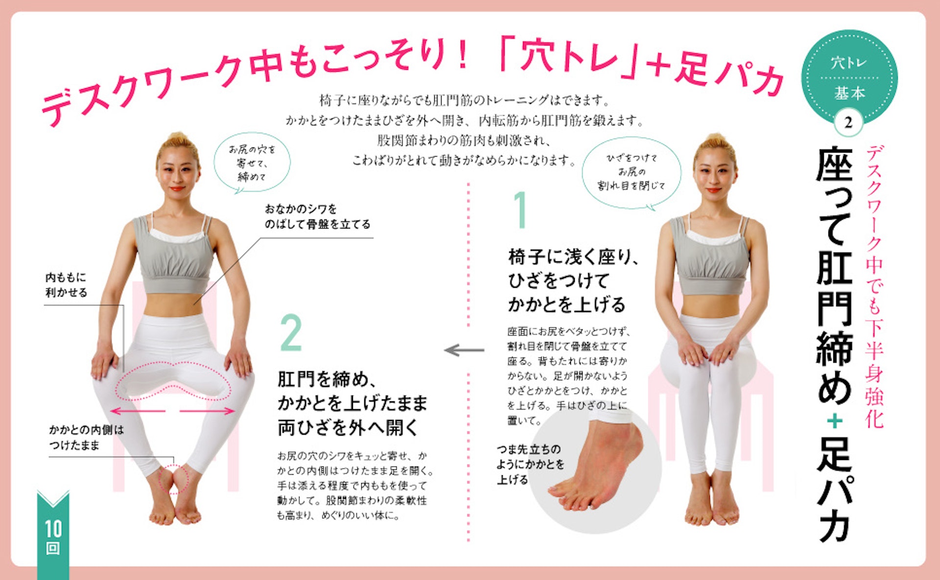 第二步——收緊肛門,抬起後腳跟、打開雙膝,維持後腳跟内側貼緊、打開雙腿,運用大腿內側肌肉開合雙腿,這個動作可以增加髖關節周圍的靈活性,來回重複10次即可。